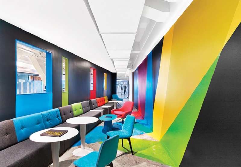 Thiết kế thi công văn phòng của Google chủ yếu sử dụng những màu cơ bản như xanh dương, xanh lá, vàng, đỏ như trên logo của họ. Những màu sắc kích thích sự sáng tạo, tư duy logic của nhân viên. Google tạo ra cho những nhân viên của mình một nơi làm việc “trong mơ” với đủ những thứ mà họ cần. Không gian phóng khoáng không làm kìm hãm sức sáng tạo của nhân viên. Thậm chí họ còn thiết kế văn phòng của mình thành nơi để nhân viên có thể vui chơi. Nhóm sáng tạo của Google đã tích hợp công nghệ mới nhất vào màn hình tương tác đầy sắc màu dựa trên các web tìm kiếm tiên tiến. Người dùng chỉ việc nhập các thuật ngữ tìm kiếm cảm xúc liên quan lên màn hình, sau đó phần mềm sẽ gợi ý các hình ảnh của một địa điểm ở New York bằng một cách nào đó. Đó chính là điểm hữu ích mà thuật toán tìm kiếm này mang lại.