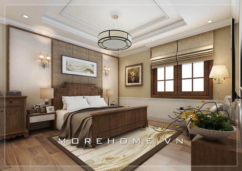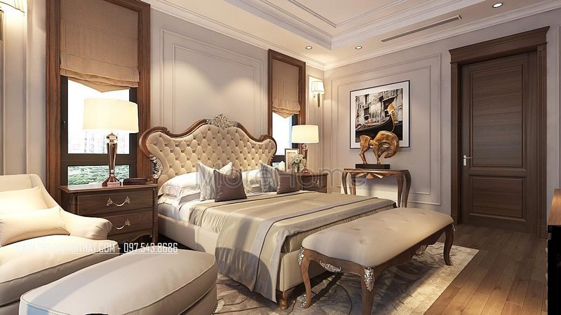 Giường ngủ bọc da tân cổ điển sang trọng, từng đường nét uống lượn cùng gam màu nâu từ gỗ óc chó thể hiện sự đẳng cấp trong gu thẩm mĩ của gia chủ tại biệt thự cao cấp
