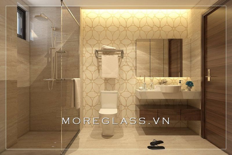 Mẫu thiết kế phòng tắm hiện đại có sự kết hợp giữa vẻ đẹp sang trọng và tinh tế với phòng tắm kính cường lực trong suốt.