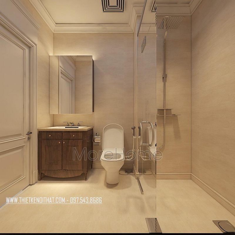 Tủ lavabo có mặt đá trắng và gỗ óc chó tân cổ điển được sắp xếp để làm nội thất cho phòng tắm, có ngăn nắp gọn gàng mang lại vẻ đẹp tinh tế và cao cấp.
