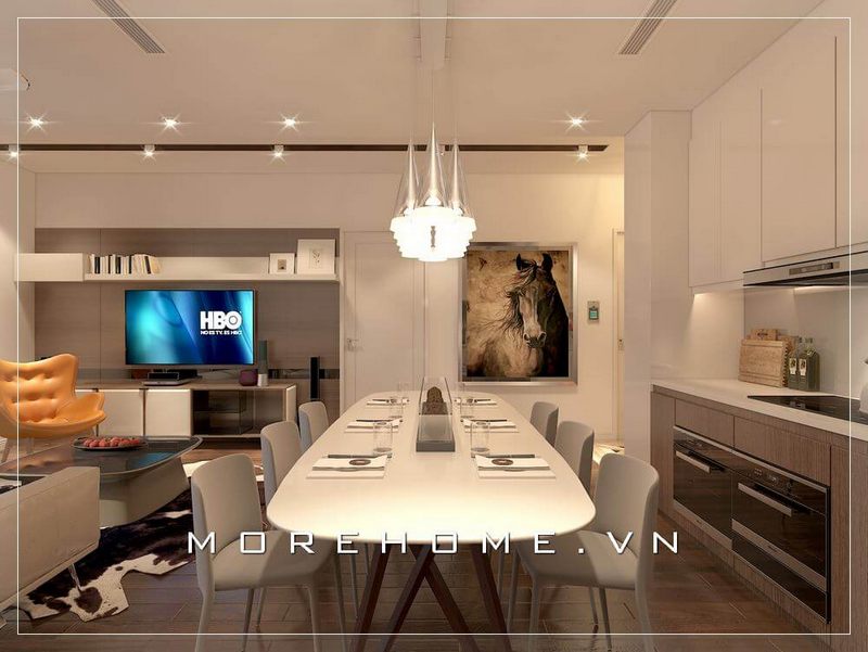 Mẫu bàn ăn mặt đá trắng cao cấp có thiết kế đơn giản và 6 ghế gỗ hiện đại, là sự lựa chọn hoàn hảo cho phòng ăn chung cư.